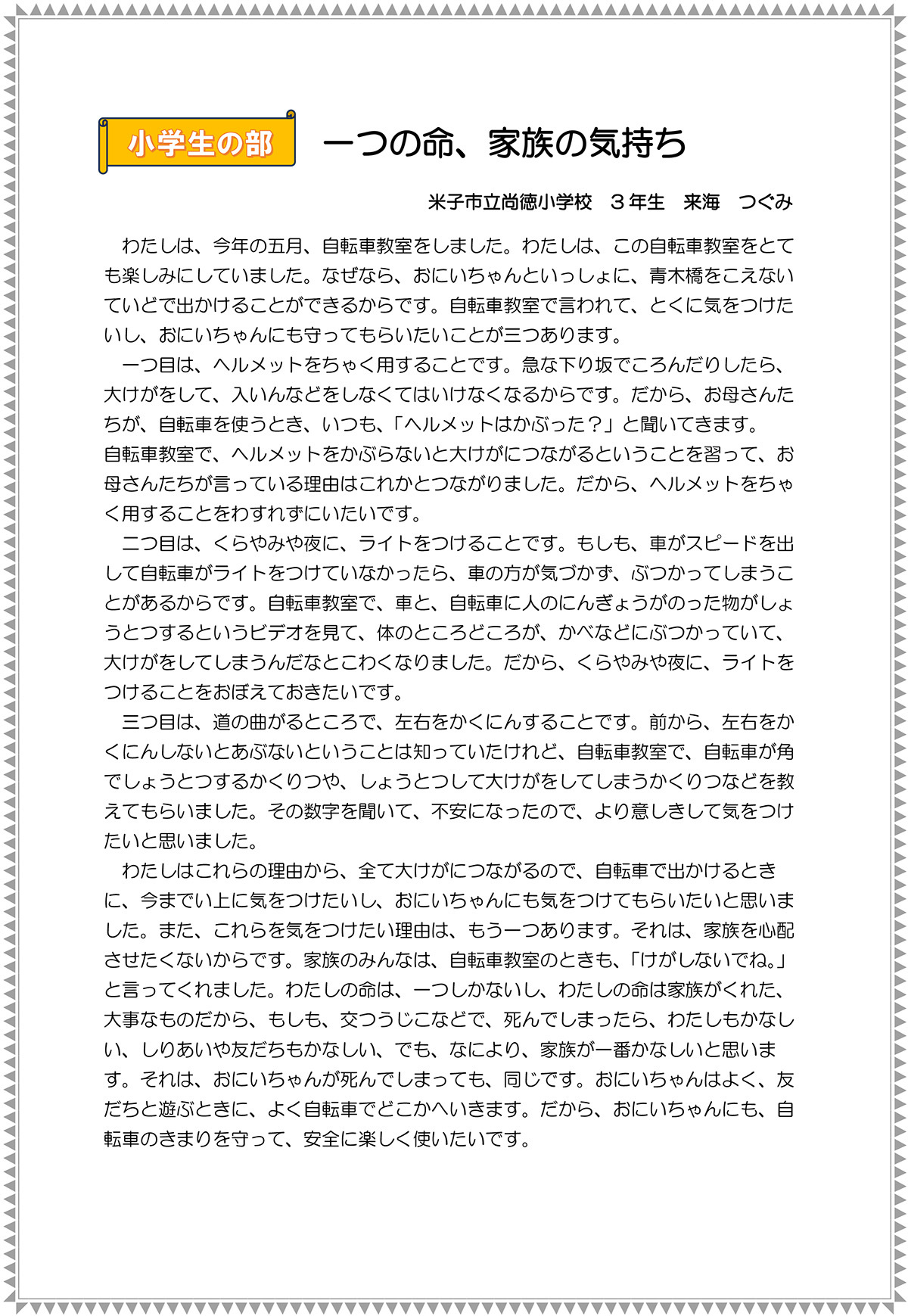 - 私が普段行っている交通安全、大人にしてほしい交通安全、私が体験した交通安全など、交通安全を主題とし、内容にふさわしい題名を必ずつけてください。