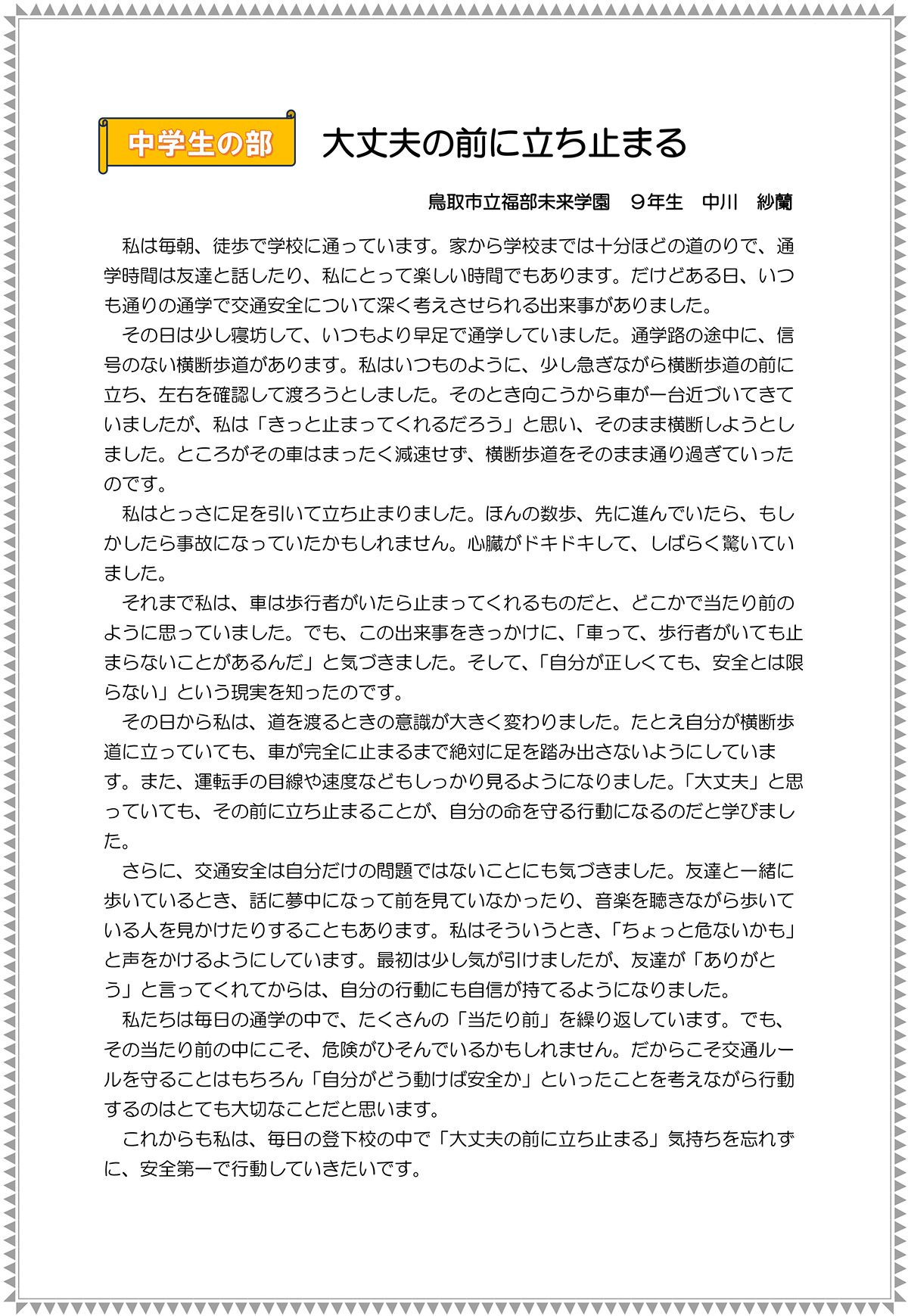 - 特別賞『鳥取県警察交通部長賞』・・・各部1名以内(賞状と3,000円相当の図書カード)